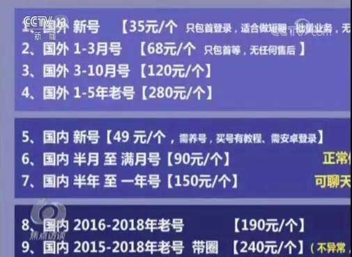 确实,在卖家发来的价格表上,新微信号35元是价格最低的一档,而一些注册时间较长,发布过朋友圈的微信号则要240元,行内人将这种微信号称为站街号。相比于35元的新微信号,这种微信号有一种特殊的功能。