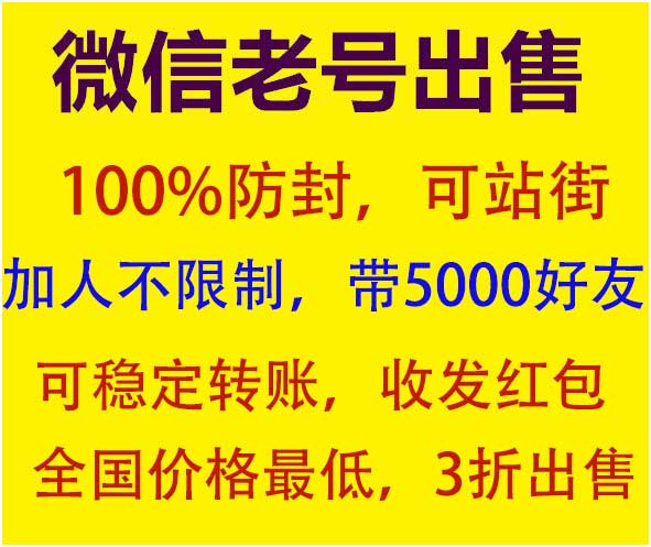 【国内满月号】注册30天以上,绑定手机号,带朋友圈,没设置微信号,有实名和未实名的【国外满月号】 注册30天以上,带朋友圈,没设置微信号,有实名和未实名的 【一年到六年私人老号】 设置微信号,带朋友圈,带实名,带记录,带支付密码,功能强大微信3000好友号:600元/个,全国地区好友(除港澳区域)可私订男女性别+区域+90%精准行业微信4000好友号:800元/个,全国地区好友(除港澳区域)可私订男女性别+区域+90%精准行业微信5000好友号:1000元/个,全国地区好友(除港澳区域)可私订男女性别+区域+90%精准行业
